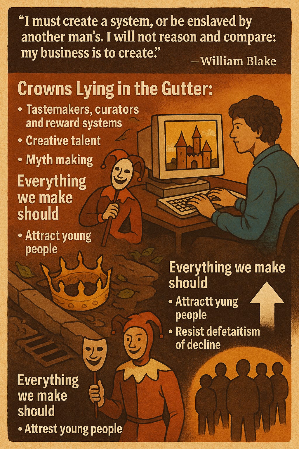 Myth making: The world is disenchanted. Yet people ache for myth, for meaning, for narrative grandeur. The Right can reclaim mythopoesis: building worlds, characters, and archetypes that resonate beyond politics. We have to create an entirely new interior mental universe for people to occupy.